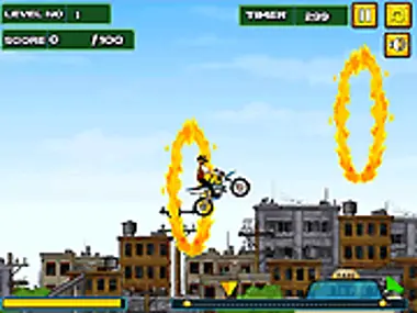 Monte na sua mota e realize acrobacias incríveis que desafiam a morte. Corra por rampas, sobrevoe autocarros e salte através do infame anel de fogo. Estes são apenas alguns dos obstáculos e perigos que o aguardam. Realize acrobacias para ganhar pontos suficientes para completar cada nível e avançar para o próximo. Consegue completar todos os 12 níveis desafiantes?