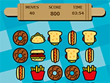 Em Food Match 3, mergulhe num divertido e acelerado jogo de quebra-cabeça onde você combina 3 ou mais itens de comida iguais encontrados numa loja de fast food, como refrigerantes, sanduíches, hambúrgueres, tacos e muito mais! Use itens especiais como água para limpar comidas ou facas para remover linhas inteiras. Com 40 movimentos para fazer as melhores combinações, crie estratégias cuidadosamente e mire em pontuações altas nesta saborosa aventura de combinar 3!
