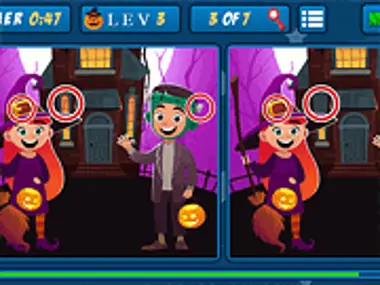 Agora é Halloween, vamos nos divertir! Por trás dessas imagens há pequenas diferenças. Consegue encontrá-las? São designs divertidos para você brincar. Um jogo divertido e educativo porque o ajudará a melhorar suas habilidades de observação e concentração. Você tem 10 níveis e 7 diferenças, para cada nível você tem um minuto para terminar. Aproveite o feriado de Halloween!