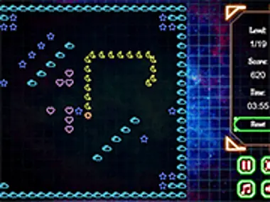 Um crossover entre Snake e Pacman. Coma todas as estrelas azuis de um nível sem morder a sua cauda. Use as teclas de seta para mover a sua cobra ou deslize na tela.